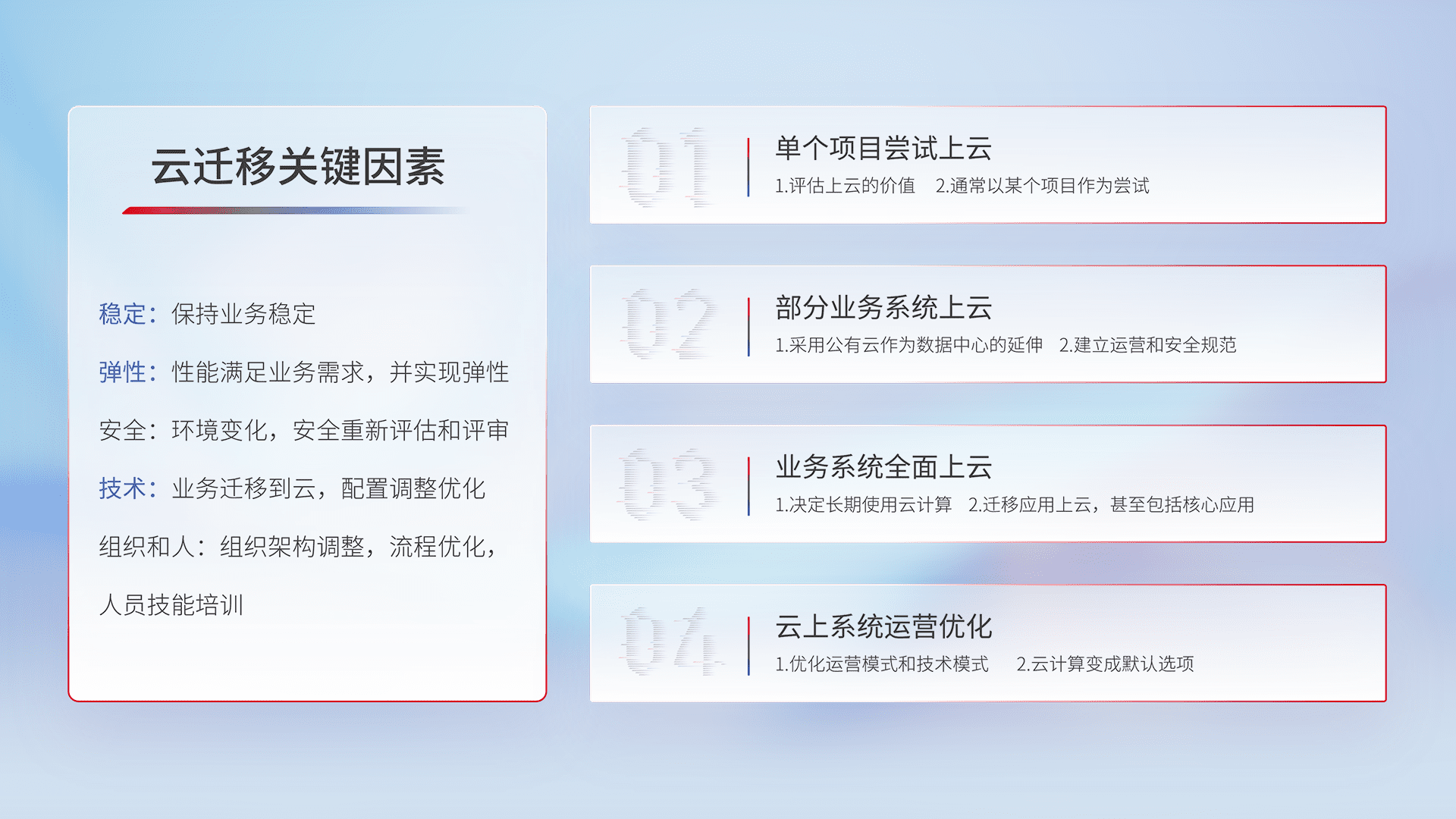 结合实际业务,,,从规划设计、、、、云平台选型、、、、云原生改造、、、数据迁移、、集成交付,,迁移全过程为客户识别最佳上云路径,,,做好风险识别管理,,,设计网络架构、、、、身份权限、、安全审计合规、、、、操作审计、、日志审计、、监控告警策略、、、、多站点容灾设计等,,,对云上基础设施进行整体规划,,,提升IT治理水平,,,,以满足弹性、、高可用、、高性能的需求。。