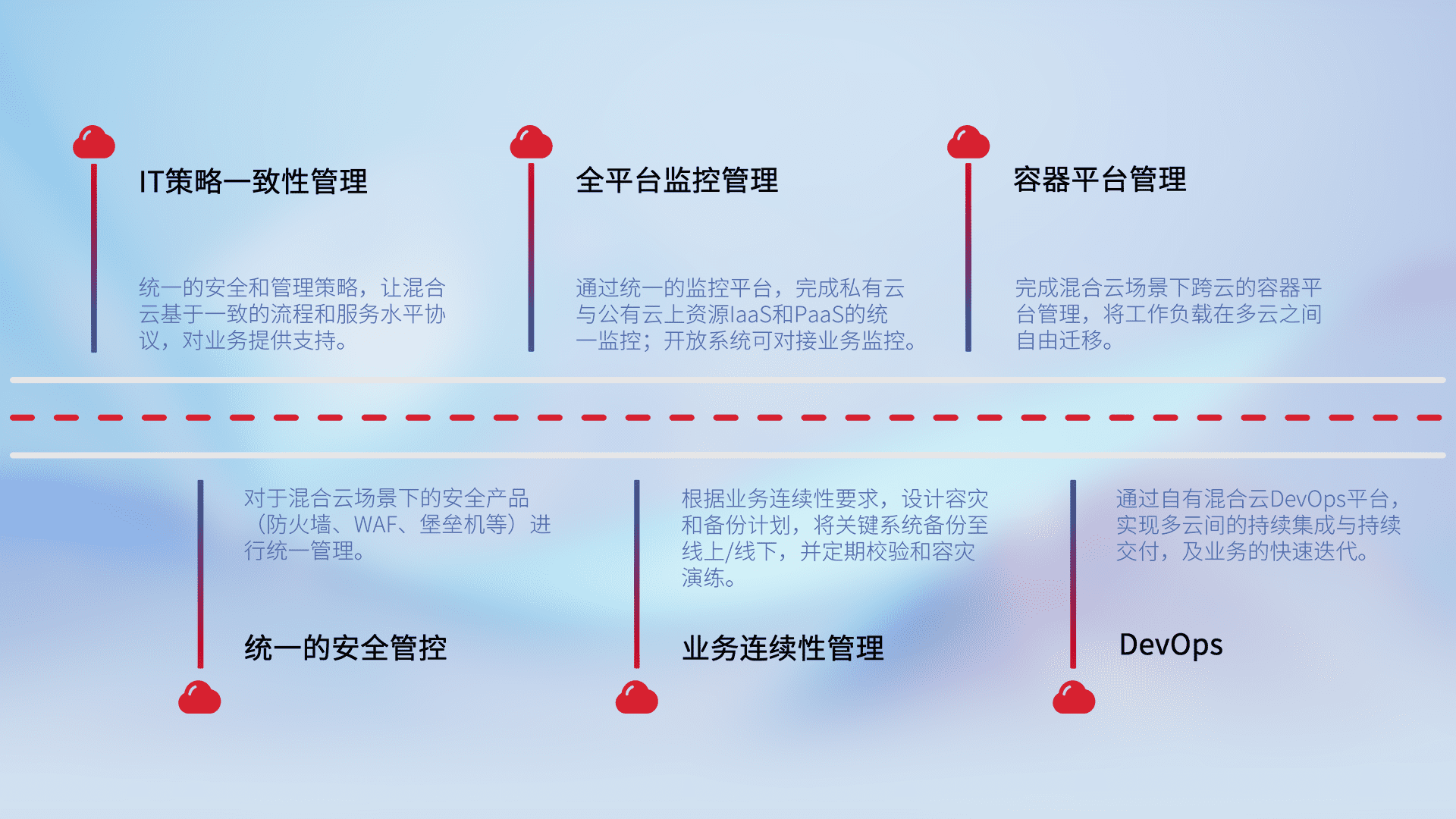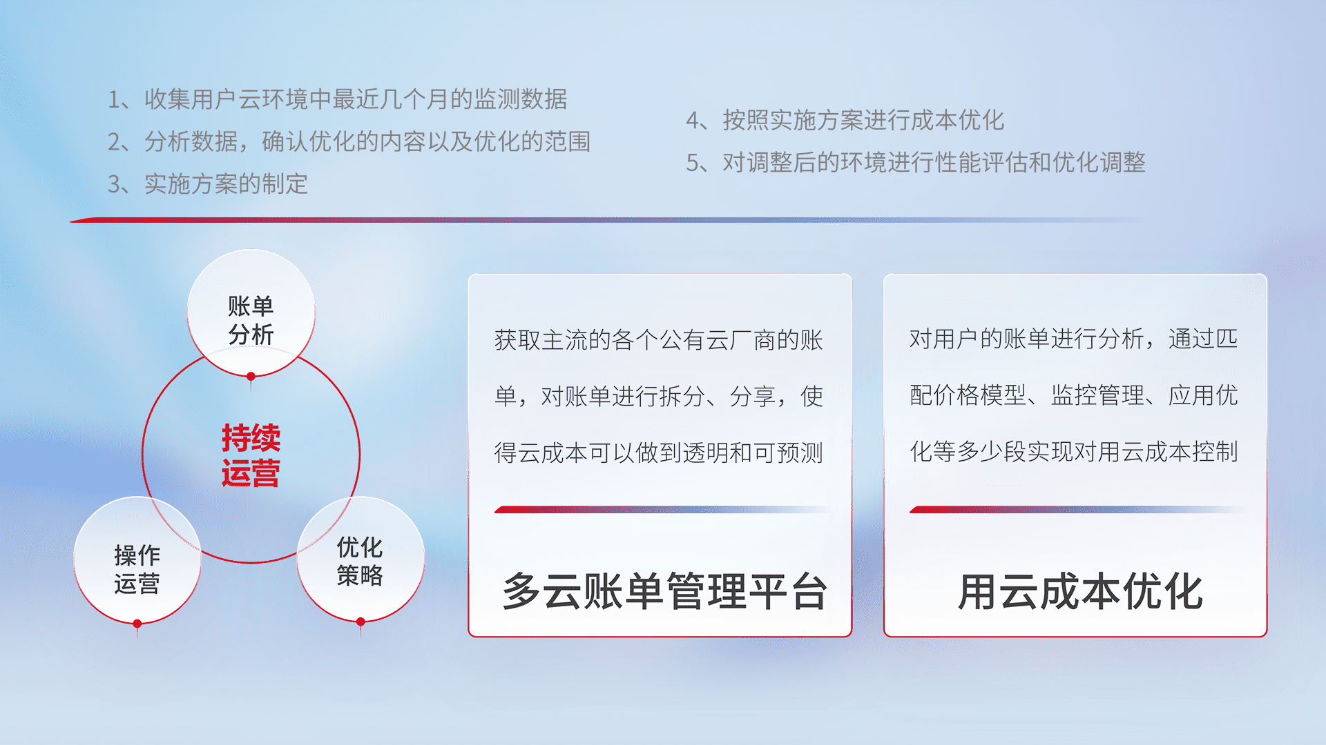 通过多云纳管,,,,以统一的资源数据模型把客户的云资源进行抽象和封装,,,,进而实现对多云资源的统一操作,,,保障云资源管理的可靠性、、稳定性与可用性。。。量身定制化运维内容,,配置、、、开发运维、、补丁管理、、、、备份、、监控、、认证和访问管理、、、、审计和日常巡检等,,保障在用云过程中的可靠度,,,,稳定度以及高可用率。。。