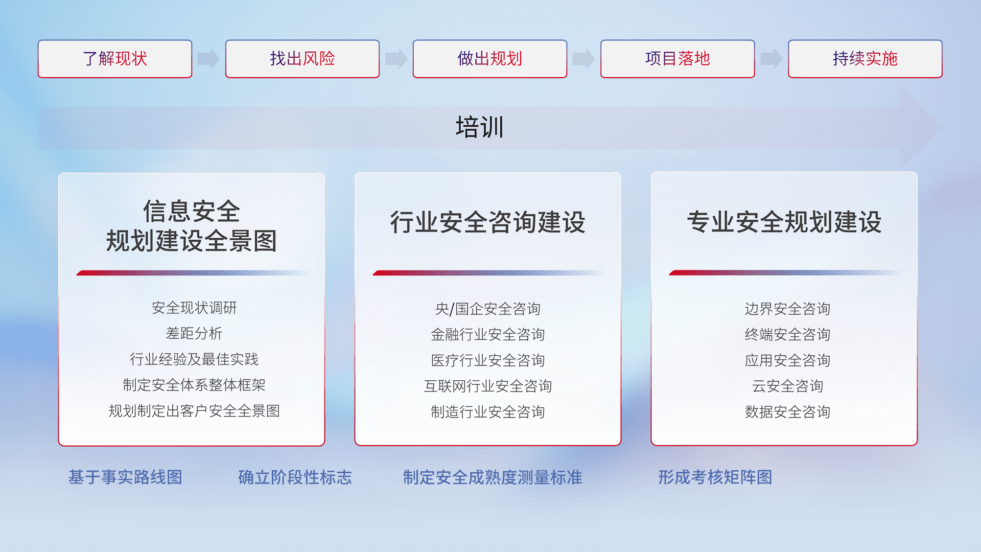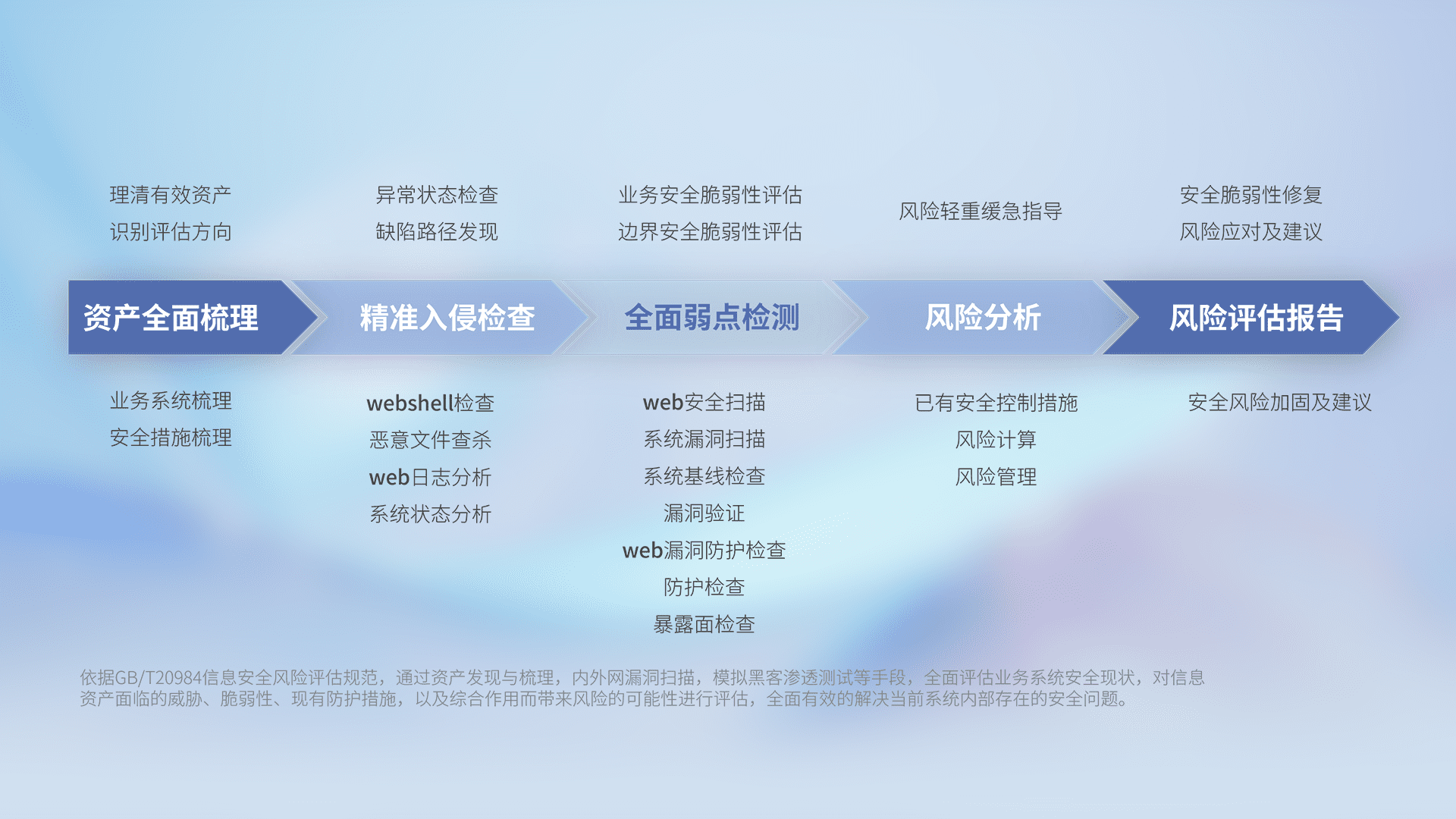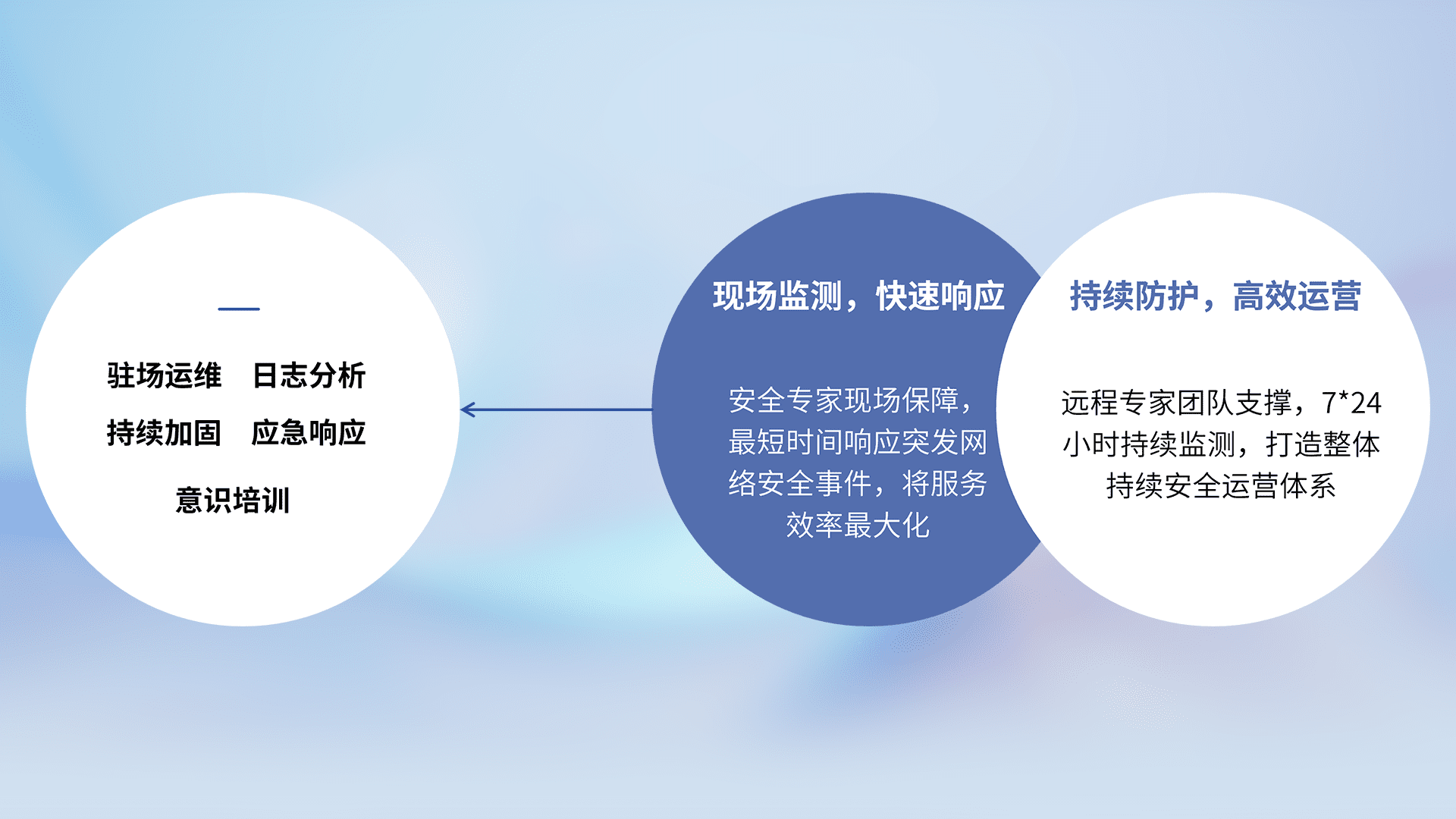 针对客户行业特性,,,,以专业的安全服务+多厂商联合解决方案提供专属的一站式安全管理服务,,帮助客户全面感知网络空间威胁,,,基于识别、、检测、、、分析、、、、防护、、监测、、、响应的服务理论模型,,从方案咨询、、集成交付、、评估验证、、、优化加固、、运维运营,,致力于为客户提供完整的闭环管理式安全服务。。以实战经验为客户打造高抵御风险的安全体系,,,帮助客户发现威胁、、、对抗威胁、、、处置威胁,,不断积累安全对抗能力,,持续保障数字化安全。。。。