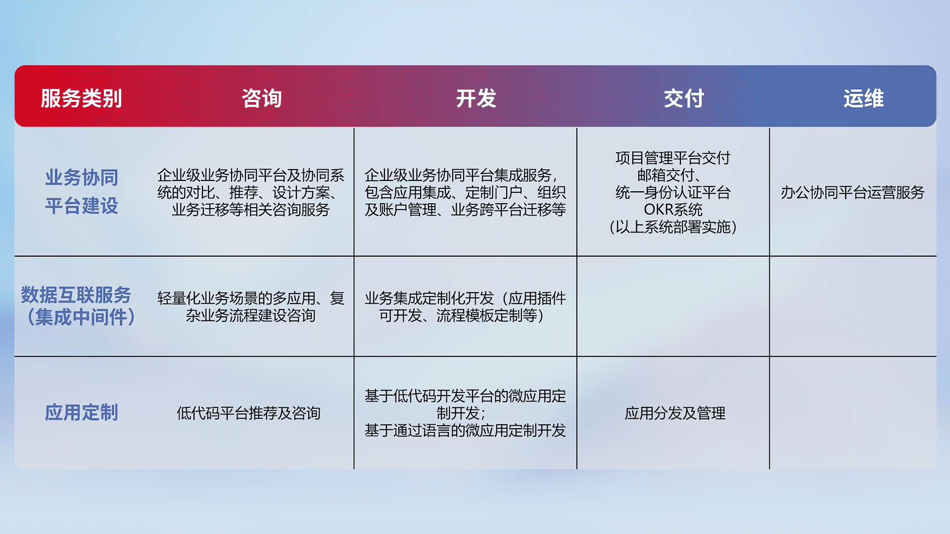 针对钉钉、、、企微、、、、IDaas等平台级产品提供产品的规划、、方案、、、、交付、、、、定制化开发等服务,,,实现如统一协同办公、、、智能客户服务、、、混合会议管理、、、智能数据查询、、、等业务场景,,,,实现数字化转型。。。